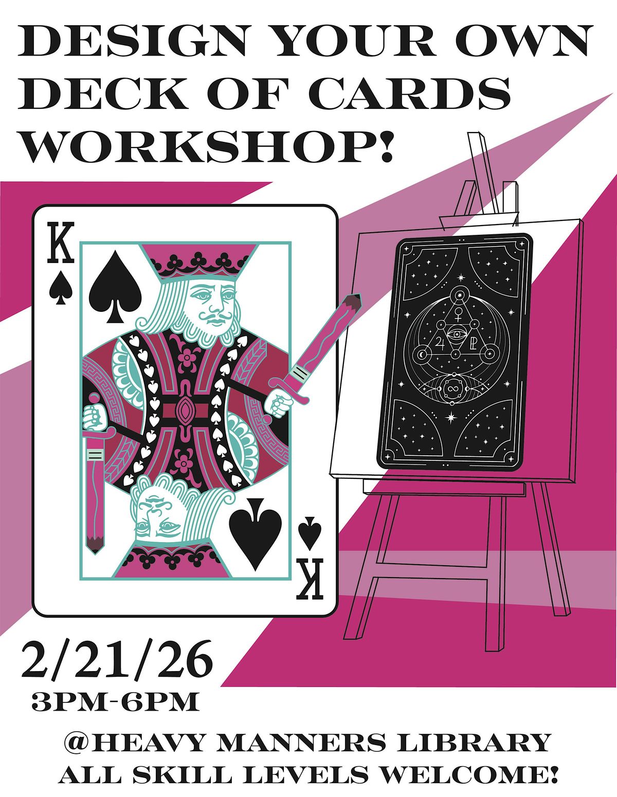 In this immersive 3-hour session, we will dive into something out of the norm. The art and craft of playing cards and tarot cards. We’ll explore theme development, symbolic language, and magical elements that give cards meaning and personality.