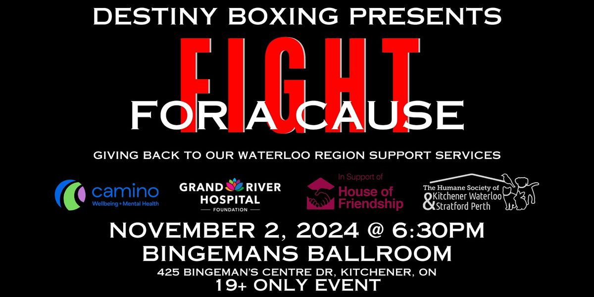 Destiny Boxing is giving back to our Waterloo Region support services with a fundraising gala at the Ballroom at Bingemans! Help us raise $20,000 to share with our 4 local charities: