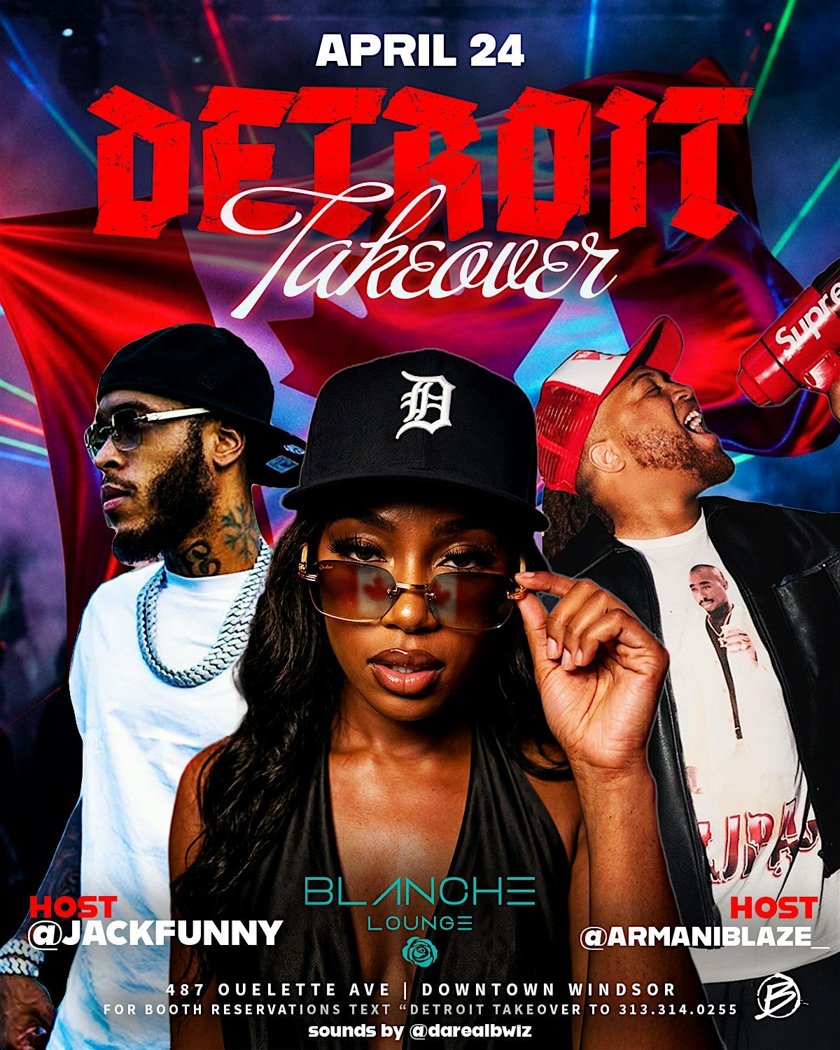 Official Detroit Takeover night - April 24, 2026 at Blanche Lounge, 487 Ouellette Ave. in Windsor. Special Guest Host: @jackfunny Music by @darealbwiz 🎧 Hosted by @armaniblaze_ You don't want to miss