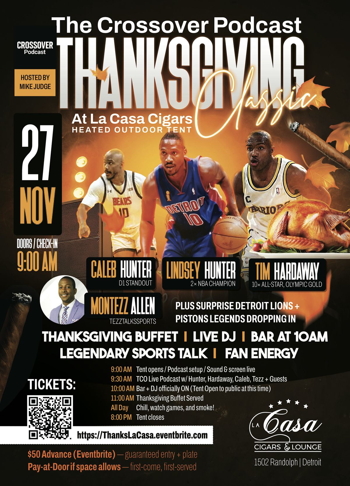An all-day heated-tent takeover at La Casa Detroit, featuring a LIVE taping of The Crossover Podcast with some of the most iconic basketball voices to ever touch the court: