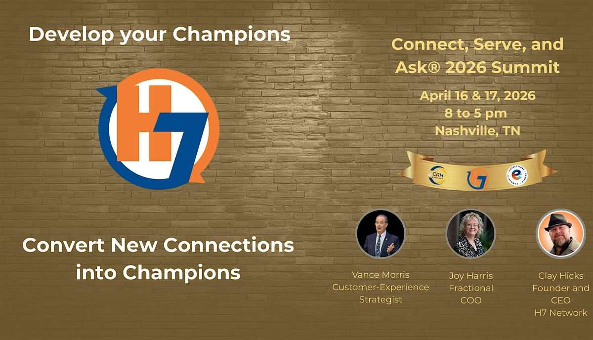 Join us for a transformative H7 meeting dedicated to elevating your networking game through the H7 Network’s powerful Connect, Serve, and Ask® Experience: Developing Your Champion Relationships. A comprehensive workshop designed to elevate your professional networking strategies inside and out of H7 Network. Developing Your Champion Relationships Workshop focuses on transforming basic professional connections into deep, mutually beneficial champion relationships.