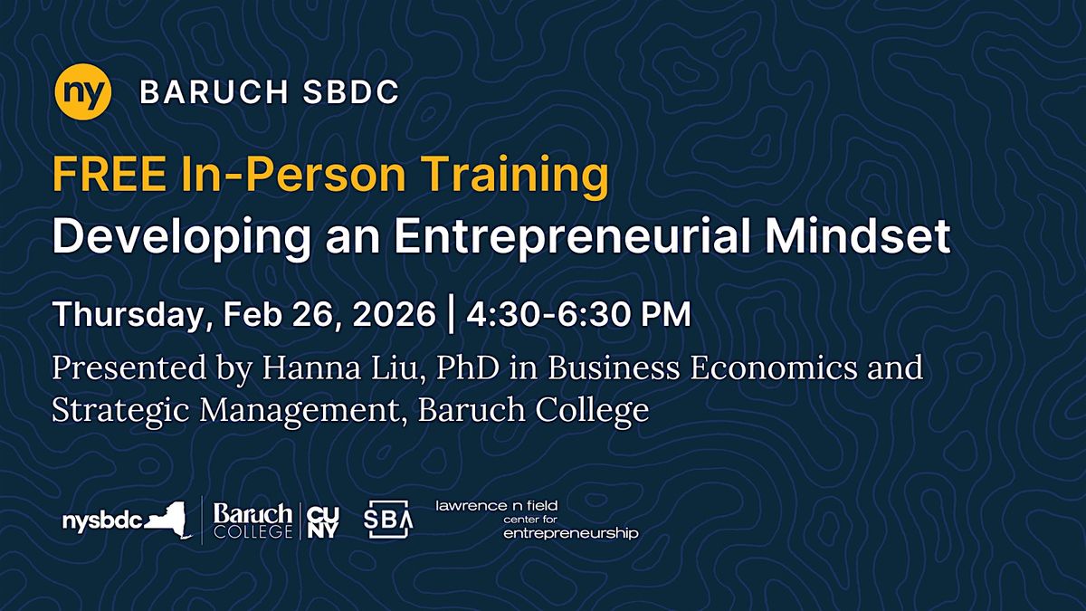 The Midtown Manhattan SBDC at Baruch College invites you to a free in-person training event on Developing an Entrepreneurial Mindset.
