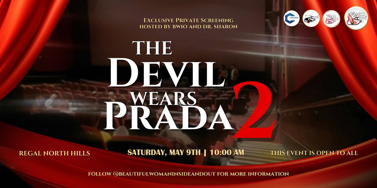 Beautiful Woman Inside & Out (BWIO) proudly invites you to an exclusive private screening of The Devil Wears Prada 2 — a high-style cinematic experience curated for individuals who understand that how you show up matters. This is not just a movie event—it’s an experience filled with flair, excitement, and moments that go beyond the screen. OPEN TO ALL!!!!