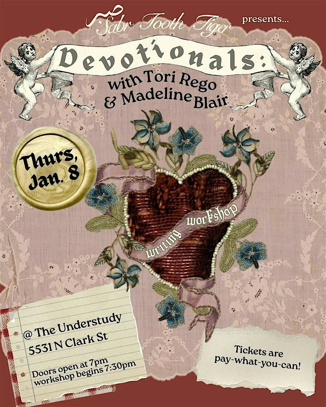“Poetic Practice as Devotion” is a 2 hour generative writing workshop co-facilitated by Tori Rego and Madeline Blair, editor/founder of Sabr tooth tiger magazine.