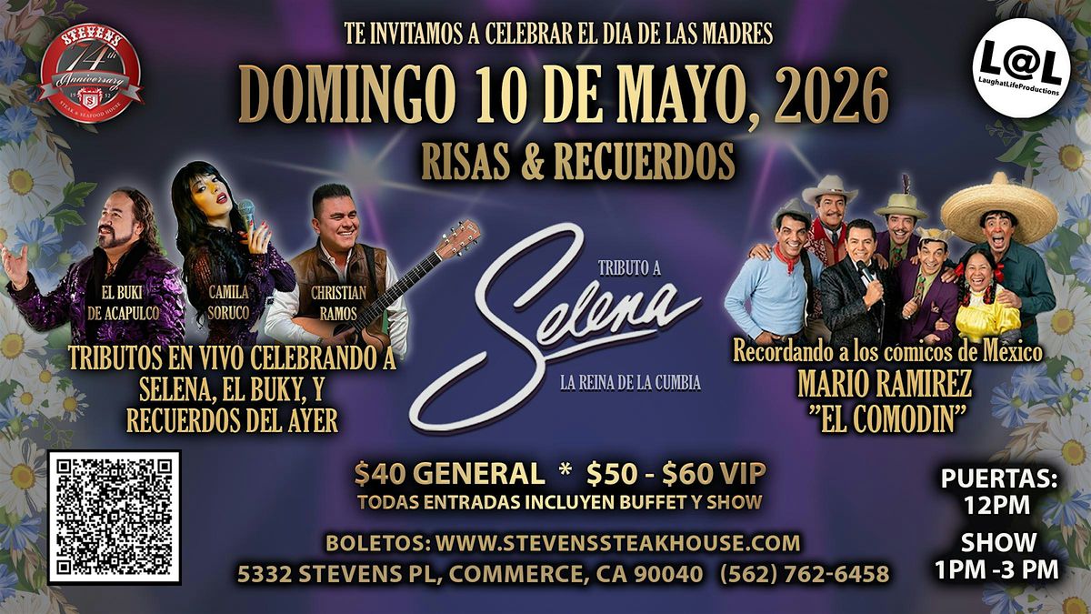 Este domingo 10 de mayo, regálale a mamá una experiencia única llena de nostalgia, alegría y gran entretenimiento. Disfruta de “Risas y Recuerdos”, un espectacular show en vivo con tributos al legado musical de Selena, la energía de Camila Soruco – La Reina de la Cumbia, y directamente de Estrella TV Cristian Ramos, “El Buki de Acapulco”, interpretando los grandes éxitos de El Buki. Además, ríe sin parar con el imitador Mario Ramírez “El Comodín”, recordando a los clásicos cómicos de México.