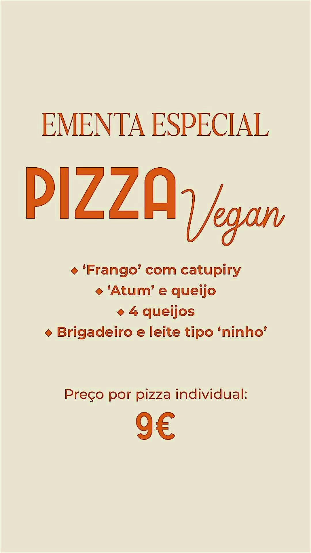 Ementa: (frango c/ catupiry, atum e queijo, 4 queijos, brigadeiro c/ leite ninho. Tudo Vegan. Reserva dá direito a 1 pizza.
