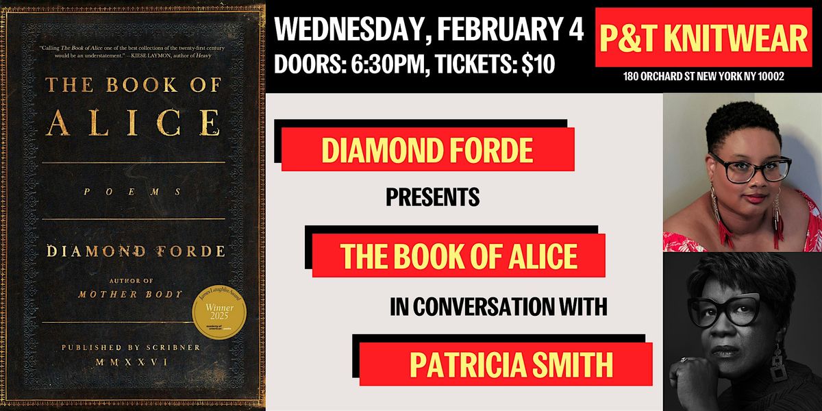 P&T Knitwear is pleased to welcome Diamond Forde to celebrate and discuss her new book, ; a stunning new collection exploring lineage and the legacy of survival as seen through the life of the poet’s grandmother Alice—a Black woman born in the Jim Crow South—using the King James Bible as a narrative framework.
