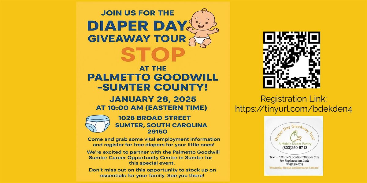 Join us for the Diaper Day GiveAway Tour STOP at the Palmetto Goodwill- Sumter County! Event Date: January 28, 2025 at 10:00 AM (Eastern Time) Location:1028 Broad Street Sumter, South Carolina 29150 Come and grab some vital employment information and register for free diapers for your little ones! We're excited to partner with the Palmetto Goodwill Sumter Career Opportunity Center in Sumter for this special event. Don't miss out on this opportunity to stock up on essentials for your family. See you there!