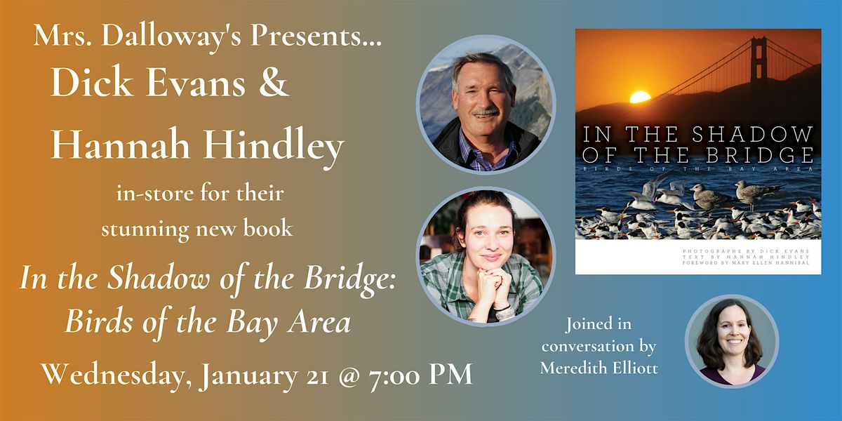 Join us at Mrs. Dalloway's on Wednesday, January 21 at 7:00 PM when photographer Dick Evans and author Hannah Hindley share a slideshow and presentation for their new book In the Shadow of the Bridge: Birds of the Bay Area. They will be joined in conversation by Meredith Elliott of Point Blue Conservation Science and will sign copies of their book after the presentation.