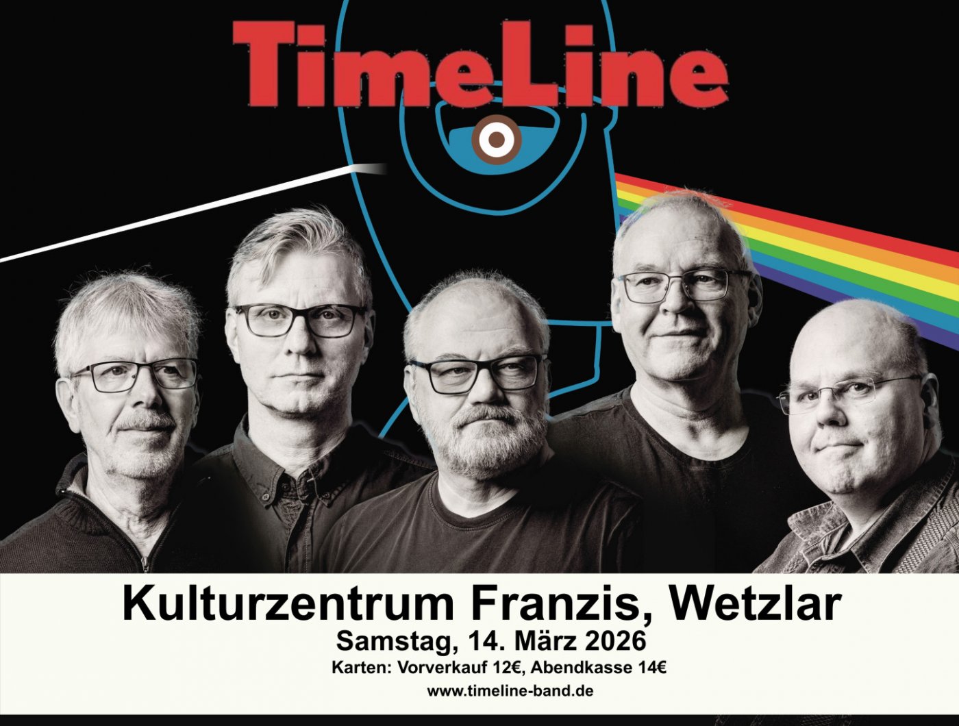 TimeLine bringt den Sound von Pink Floyd live auf die Bühne. Höhepunkt des Abends ist die Aufführung des kompletten Kultalbums „The Dark Side Of The Moon“, ergänzt durch legendäre Konzertmomente aus Pompeji (1972) und Earls Court (1994). Authentisch, musikalisch präzise und mitreißend interpretiert – eine Hommage für echte Floyd-Fans. www.timeline-band.de