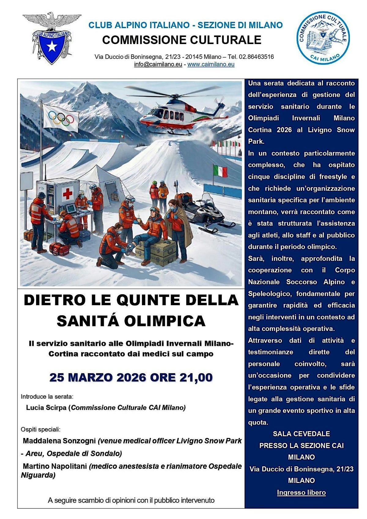 La Commissione Culturale del CAI Milano è lieta di invitare soci e appassionati a una serata dedicata al racconto dell’organizzazione del servizio sanitario durante le Olimpiadi Invernali Milano Cortina 2026 presso il Livigno Snow Park.