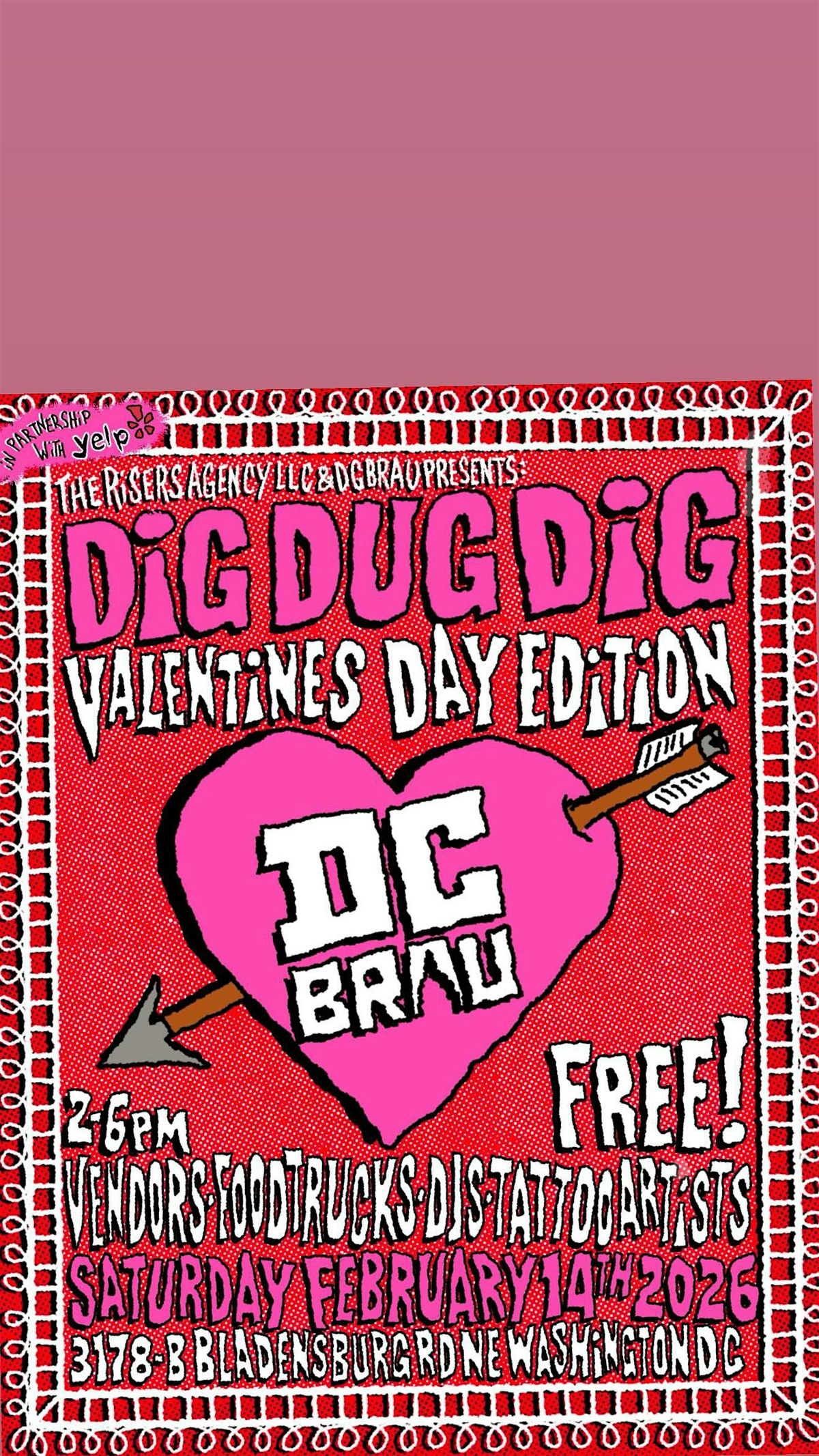 In partnership with Yelp, The Risers Agency, LLC. presents: Dig Dug Dig: Valentine’s Day Edition on Saturday, February 14, 2026, in Washington DC from 2-6pm. The event is free and all ages are welcome to join the festivities.