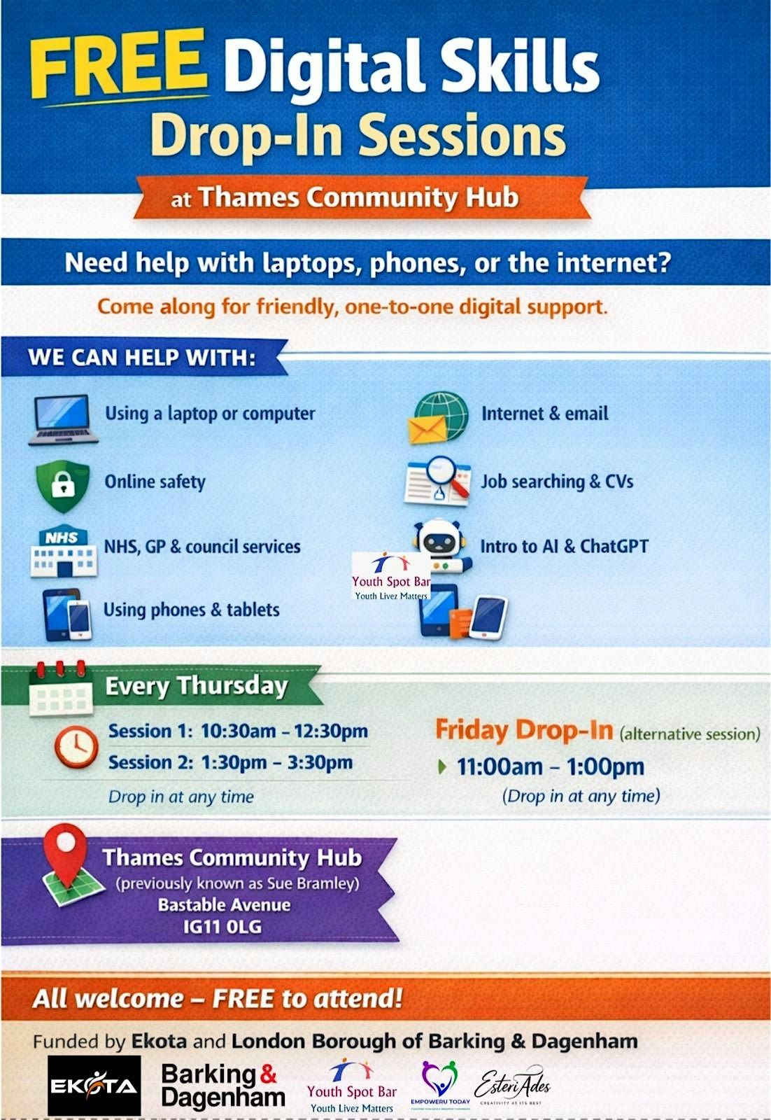 A weekly digital skills session running every Thursday for 8 weeks, supporting people to learn new online skills with access to laptops and tablets from the library hub at Thames View Community Hub.
