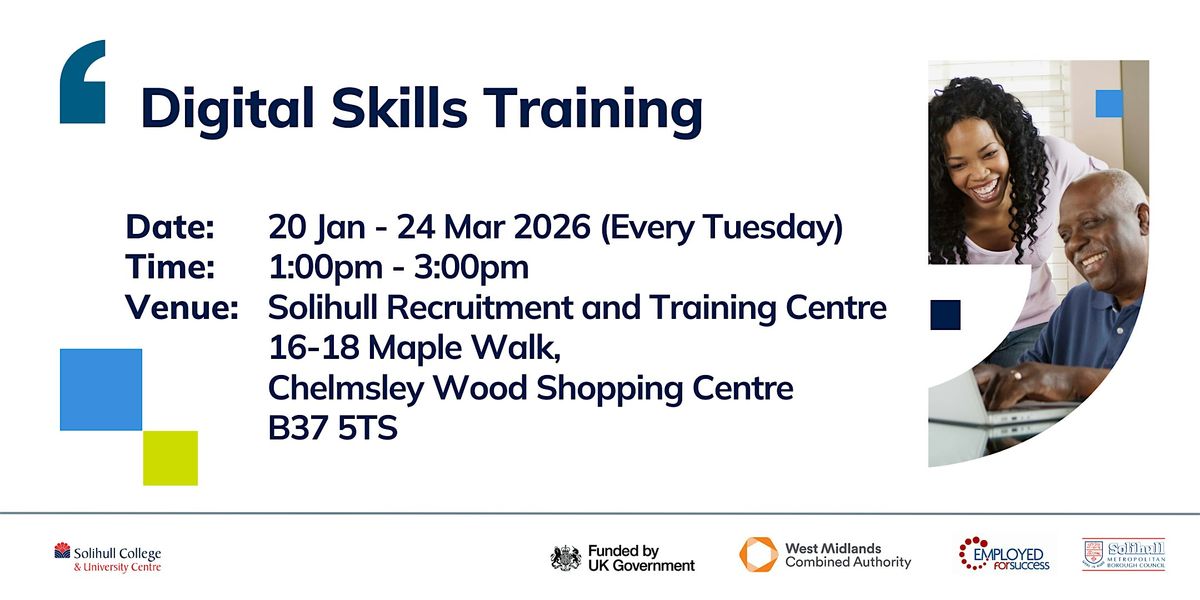 Solihull College are delivering Digital Skills Training at Solihull Recruitment and Training centre from Tuesday 20th January 2026 to Tuesday 24th March 2026.