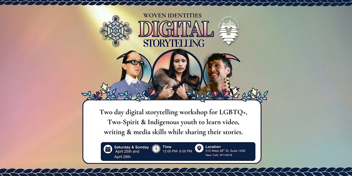 Join us for the Woven Identities Digital Storytelling Workshop, a two-day immersive experience designed for LGBTQ+, Two-Spirit, and gender-expansive Indigenous youth to explore storytelling through digital media.