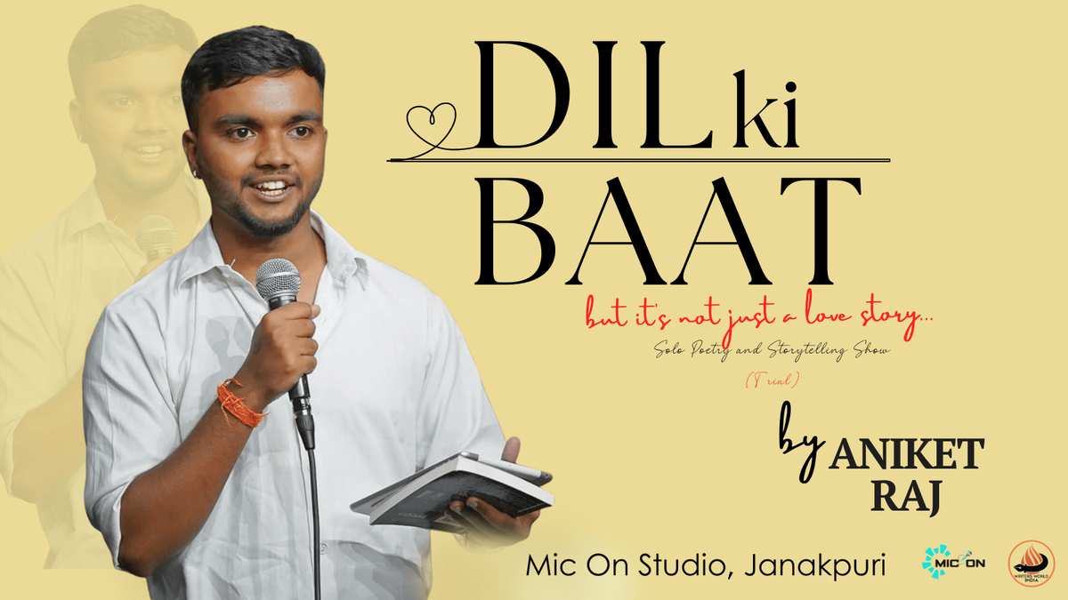 It’s more than just a performance; it’s a journey through life."Dil Ki Baat" is not just another love story. Join Aniket Raj as he takes the stage for his first-ever solo poetry and storytelling show. From the innocent struggles of childhood and the pain of body shaming to the sting of heartbreaks and the lessons learned through failure—this show is a raw, honest, and unfiltered look at life.Experience an hour of soul-stirring poetry and relatable stories that will make you reflect, shed a tear, and perhaps find a reason to smile. Come, witness the story of how a writer was born from the echoes of life’s challenges.Duration: 60 Minutes of Pure EmotionGenre: Storytelling & PoetryLanguage: Hindi/Hinglish
