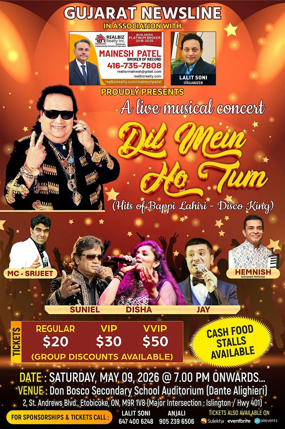 Immerse yourself in an enchanting evening of romantic melodies at "Dil Mein Ho Tum," a live auditorium concert paying tribute to the legendary Bappi Lahiri. Presented by Gujarat Newsline, this special seated showcase celebrates the soul-stirring love songs and timeless classic hits of the iconic composer. Sit back, relax, and let the sensational vocal lineup of Suniel, Disha, and Jay—accompanied by instrumentalist Hemnish and MC Srijeet—serenade you with Bappi Da's most beautiful chart-toppers. Gather your loved ones, enjoy the inviting atmosphere with delicious offerings from the on-site cash food stalls, and prepare for a captivating night of nostalgia, beautiful music, and unforgettable live performances.
