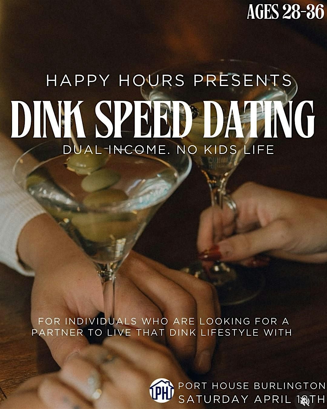 Happy Hour is excited to host another DINK Speed Dating. This event is to connect individuals that are looking to live a kid free lifestyle! This theme lets you jump in knowing you are on the same page on at least on important lifestyle topic!