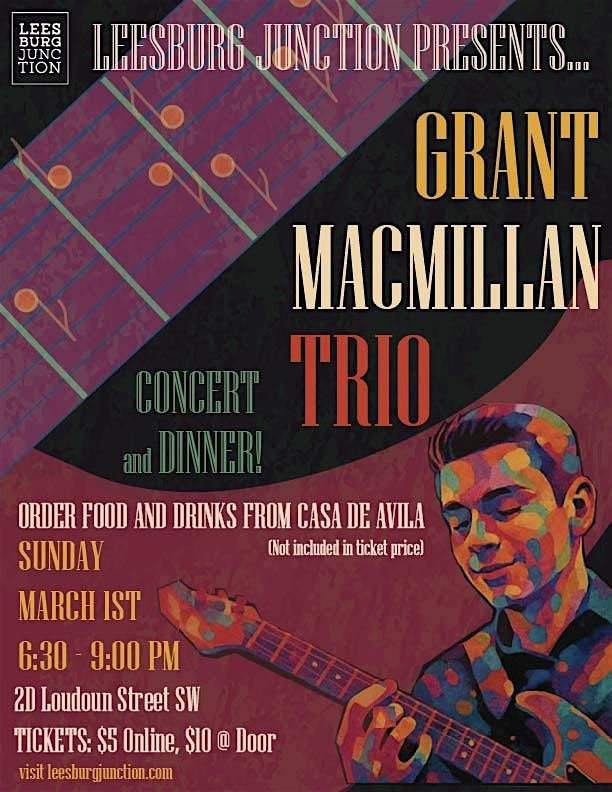 Join us for a special night of jazz music with the Grant MacMillan Trio. Come sit down, relax, and order a delicious authentic Mexican dinner as you enjoy the show. The Leesburg Junction is in the heart of downtown Leesburg. There are a limited number of seats so don't hestiate to purchase your tickets!