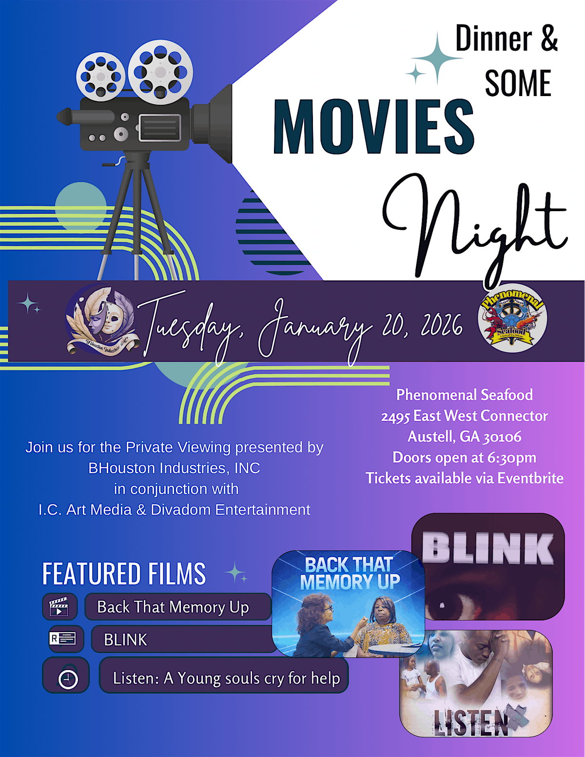Doors open at 6:30p. 3-4 "Short" Films will be previewed. Each film may include a brief Q&A. Ticket purchase covers the cost of meal and associated beverages. Alcohol will be available for additonal purchase. (BHouston Industries Platinum Pass participants will receive a discounted rate.)