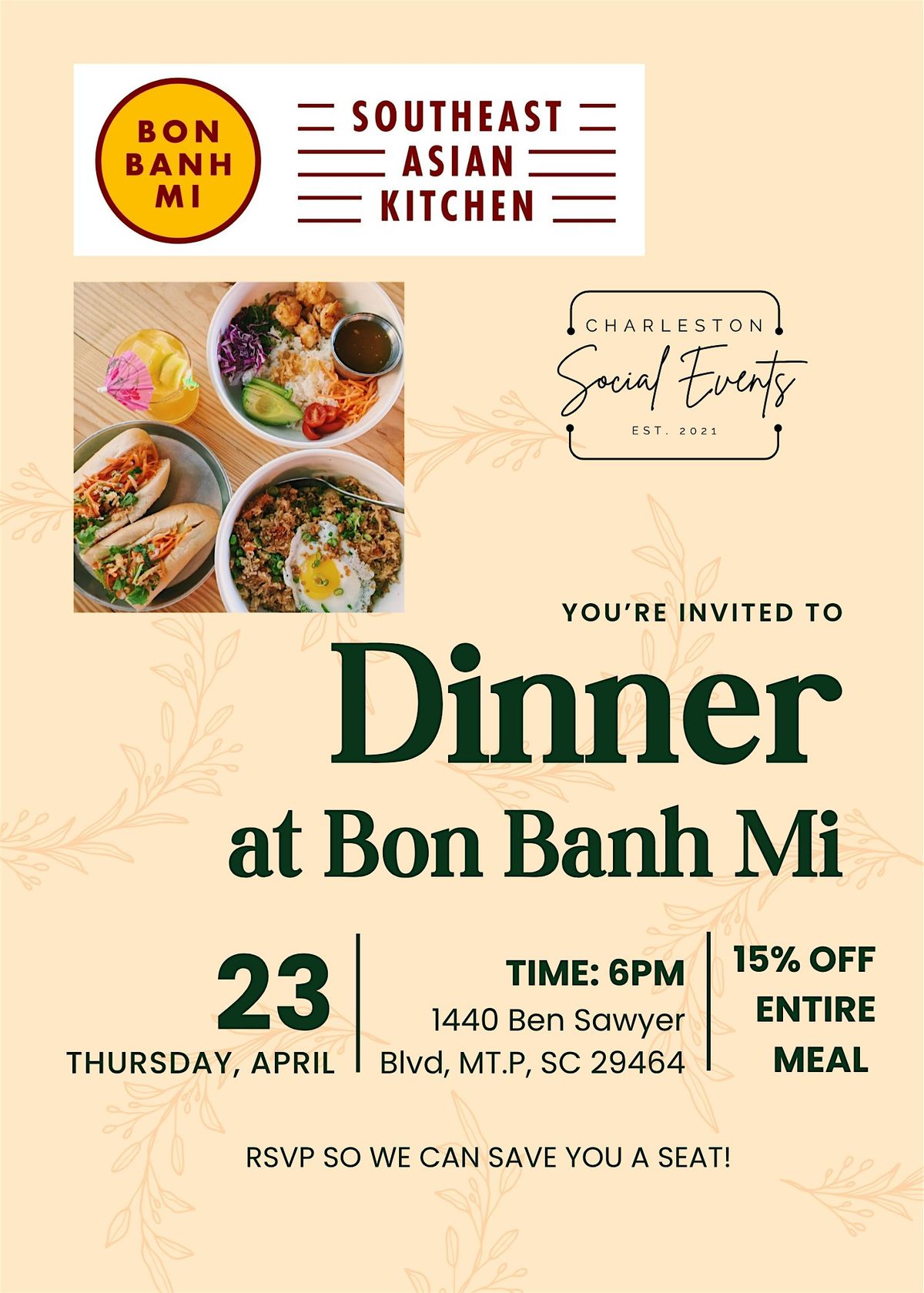 Join Charleston Social Events for a laid-back evening of flavors and fun! Enjoy delicious meals in the heart of town, right at Bon Banh Mi. It's an in-person gathering perfect for food lovers who wanna chill, chat, and munch on some seriously tasty bites. Don't miss out on good vibes, great company, and even better food! Plenty of GF, vegan, and vegetarian options! Guest will get 15% off their meal when you join us on Thursday, April 23 at 6pm.