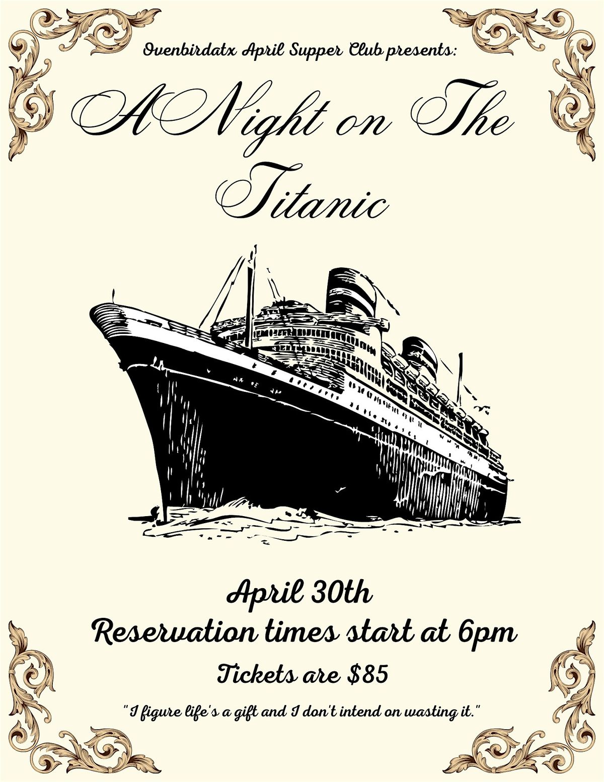 Join us for a unique dining experience at Ovenbird | Austin on April 30, 2026 at 6:00 PM. Dive into a night inspired by the Titanic, with great food and even better company. Don’t miss out on this fun, fancy evening where history meets flavor!