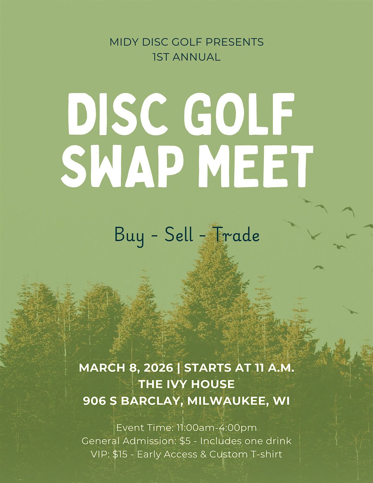 Midy Disc Golf is hosting a Disc Golf Swap Meet on March 8th from 11:00am–4:00pm, at The Ivy House, 906 S Barclay, Milwaukee, Wi.