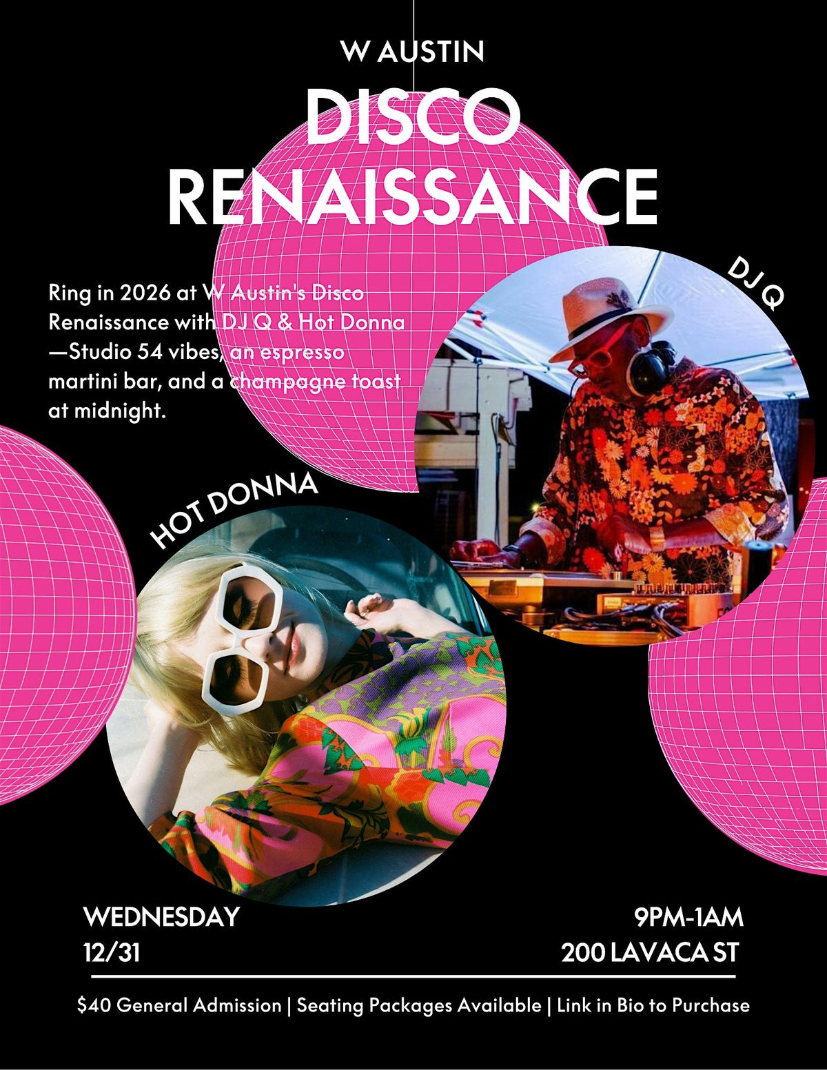 Step into Disco Renaissance this New Year’s Eve at W Austin—your ultimate destination to dance, drink, and dazzle into 2026. Inspired by the legendary Studio 54, the night comes alive with electric vinyl sets from DJ Q and Hot Donna, an elevated espresso martini bar, and a complimentary champagne toast for every guest at midnight.