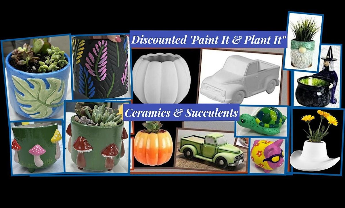 It's Spring time and time to move some overstock from last years classes! Come join us in this opportunity to get a discounted ceramic planter! With a wide variety of colors, paint it and then we'll seal it to give it a nice glossy shine! Then pick from a large variety of succulents to fill your new creation! Succulents are optional - your creation can be used for many things! All supplies provided and NO EXPERIENCE necessary! There's a couple piggy banks too if you wanna bring a young one to join you!