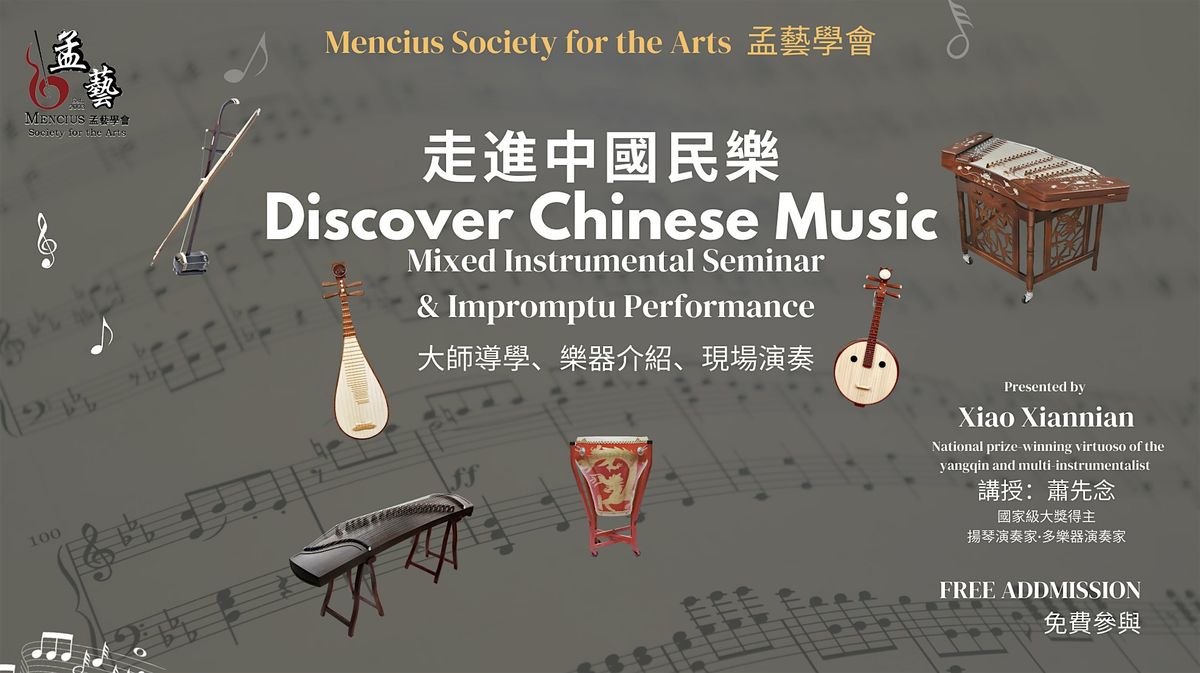 Join the Mencius Society for the Arts for a special cultural event. This is more than just a lecture; it is an immersive artistic journey. We are honored to host Mr. Xiao Xiannian, a national prize-winning virtuoso, to lead an exploration of the unique charm of Chinese traditional music.