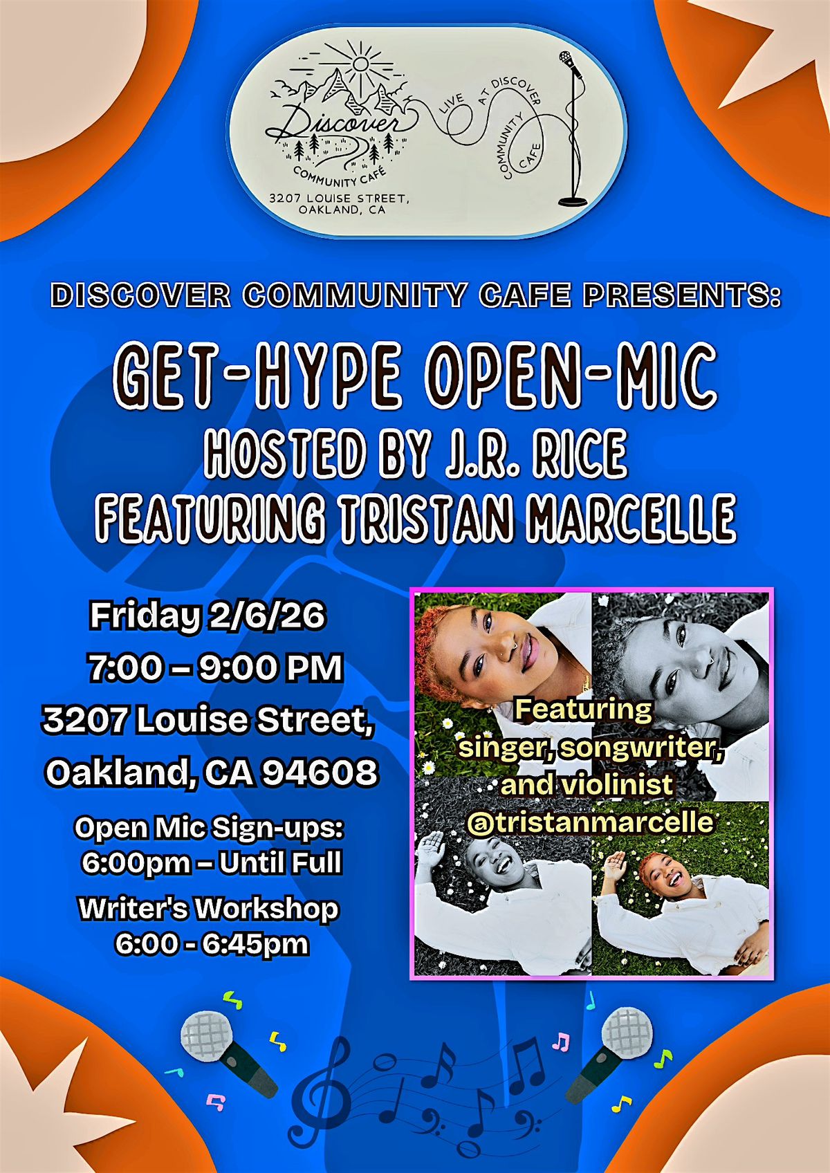 Join us for Discover Community Cafe Presents: Get-Hype Open-Mic hosted by Oakland raised author and poet,. Come through to this FREE EVENT at 3207 Louise Street, Oakland, CA 94608 on Friday February 6th, 2026 from 6:00-9pm for an open mic like no other. Whether you're a poet, musician, comedian, or storyteller, here is your opportunity to share your work to the world.