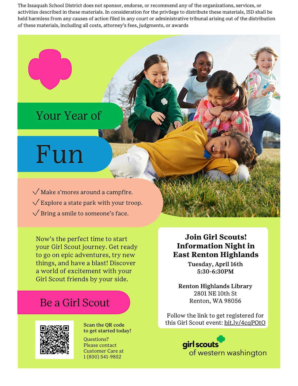 This is an IN-PERSON event at the Renton Highlands Library for families looking to join Girl Scouts!