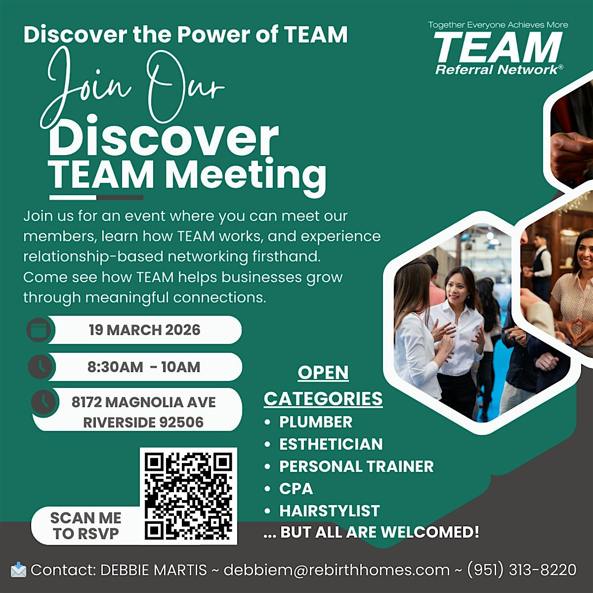 Join us for a Discover TEAM Meeting in Riverside and experience how TEAM Referral Network helps professionals grow their businesses through meaningful connections and structured referral relationships.