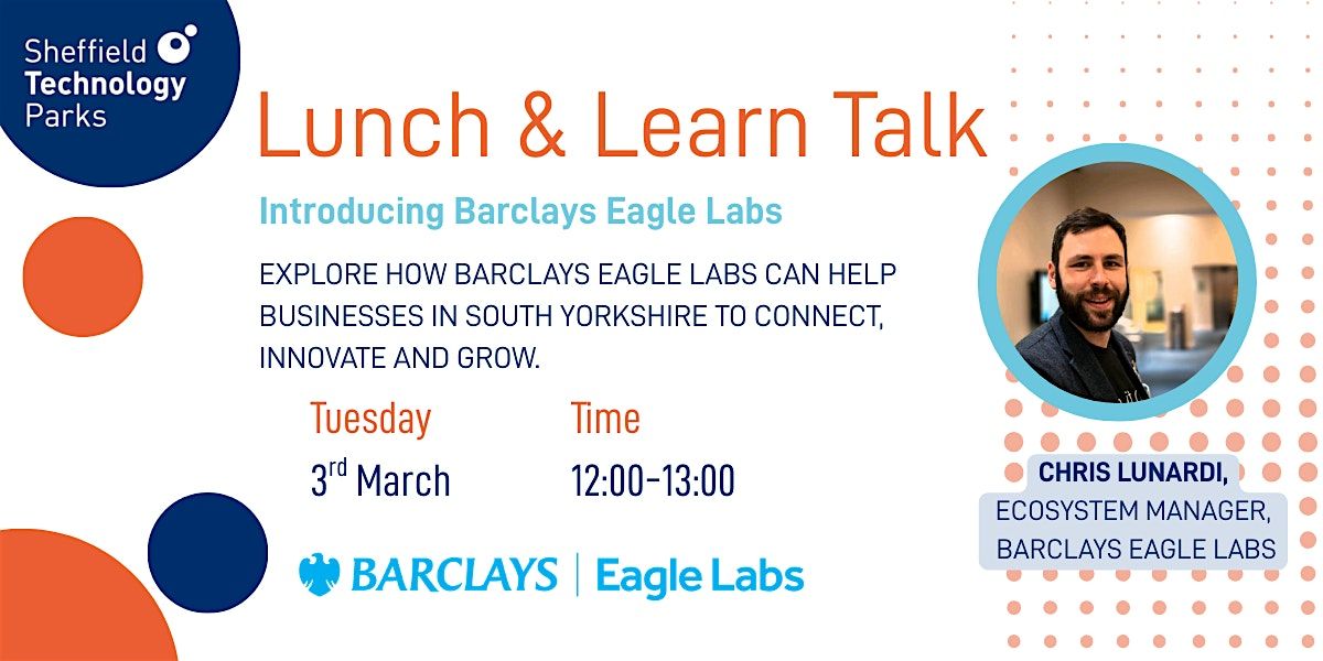Join us for an informal Lunch & Learn session with Chris Lunardi, Ecosystem Manager at Barclays Eagle Labs, to explore the wide range of support available to early-stage founders and growing businesses in Sheffield and South Yorkshire. Barclays Eagle Labs help businesses to connect, innovate and grow. This session will introduce the Barclays Eagle Labs community and explore how its services complement and build on the help available through Sheffield Technology Parks and our incubation programme, the Cooper Project.