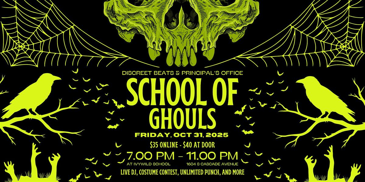 Step inside the School of Ghouls! Colorado Springs’ most thrilling Halloween event of 2025. Hosted at the historic Ivywild School by Discreet Beats and Principal’s Office, this one-night-only party transforms the building into a haunted haven of music, costumes, and Halloween mischief.