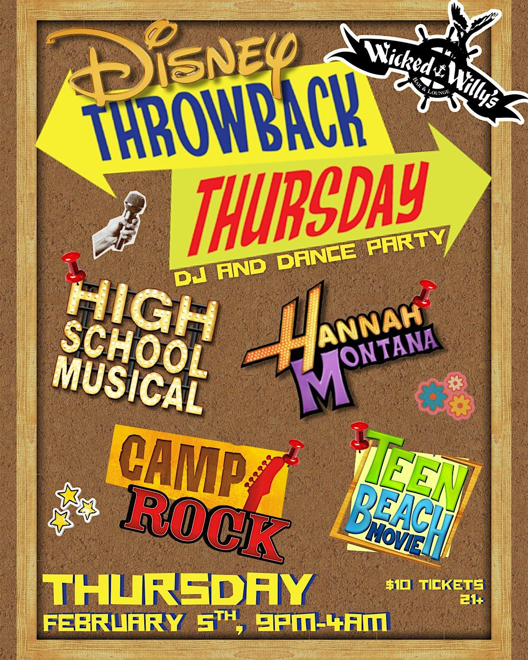 Join us at Wicked Willy's to get your Camp Rocked... or your Hannah Montana-d. Nevermind. Come for a crazy night of Disney throwbacks!!About this Event