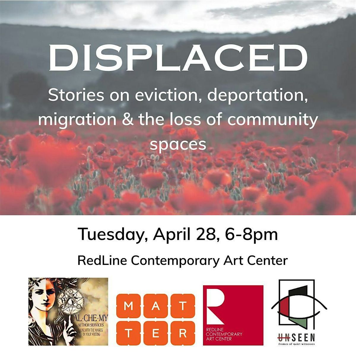 Presented by Alchemy Author Services, in collaboration with Matter Books, (UN)SEEN Frames of Quiet Witness, and RedLine Contemporary Art Center.