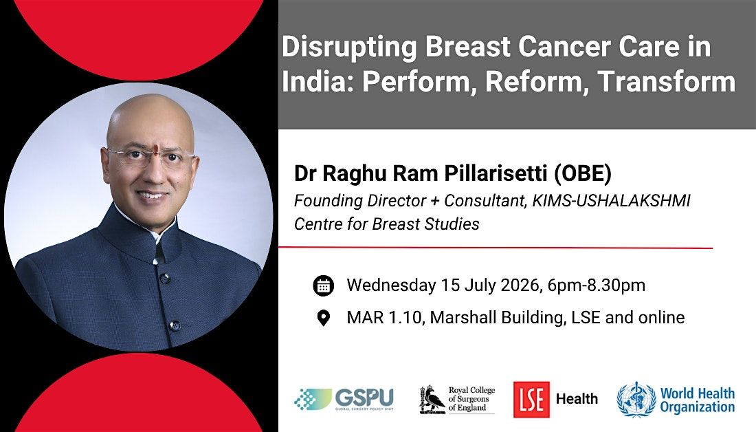 The Global Surgery Policy Unit, hosted by LSE Health and the Royal College of Surgeons of England, is delighted to welcome Dr Raghu Ram Pillarisetti, one of India’s most influential breast cancer surgeons and Founding Director of the KIMS-USHALAKSHMI Centre for Breast Diseases. Dr Pillarisetti’s lecture will shed light on how innovation, advocacy, screening and professional leadership have driven system-wide change in breast cancer care in India.
