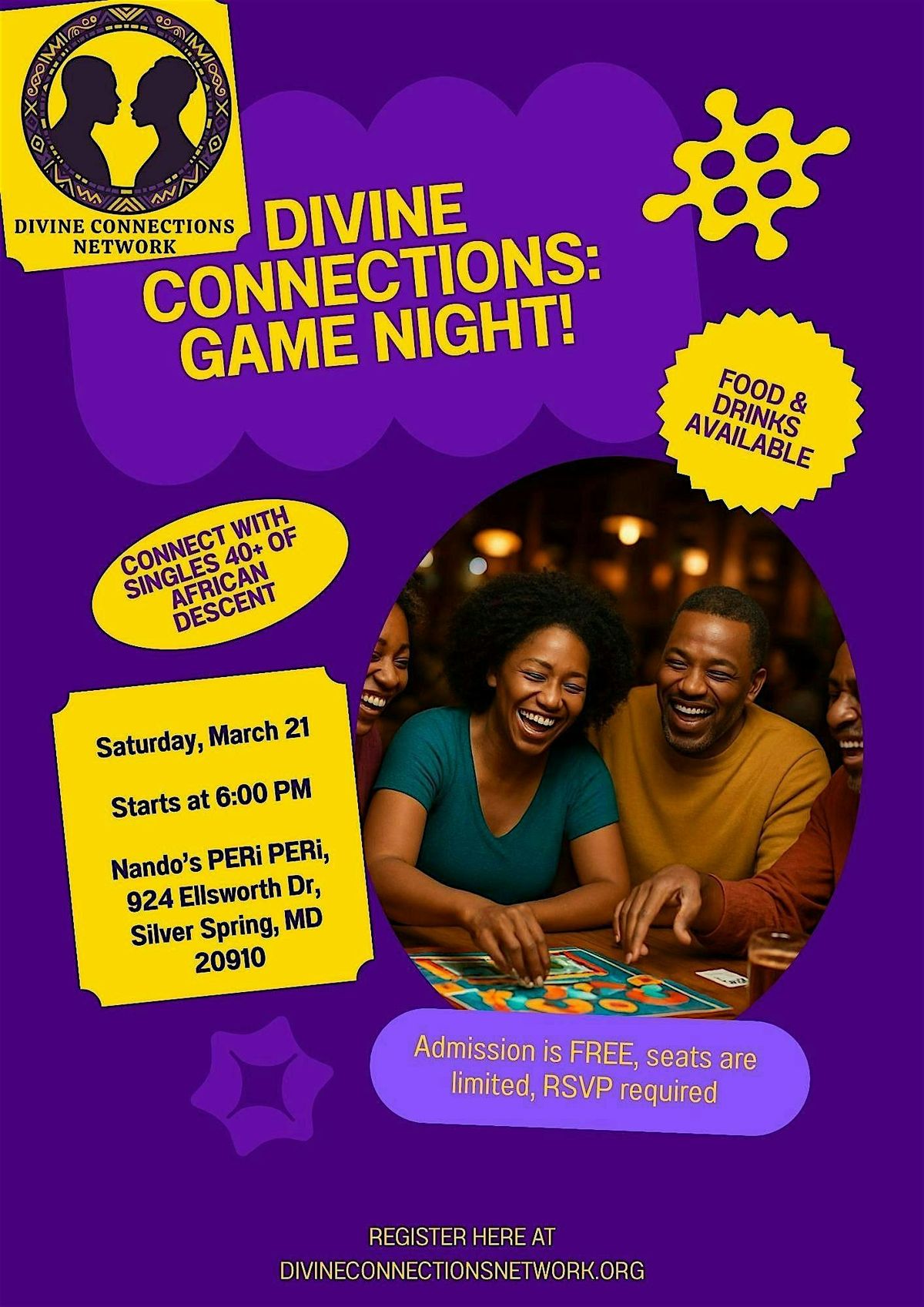 Hey there! Ready for an epic night of fun and laughs? Join us in person for Divine Connections: Game Night! — a chill evening to connect with Christian single men and women of African descent 40+ years! It will be packed with awesome games, great vibes, and good company. Whether you’re a board game pro or just looking to meet new friends, this is the place to be. Don’t miss out on the fun—come connect, compete, and create unforgettable memories!