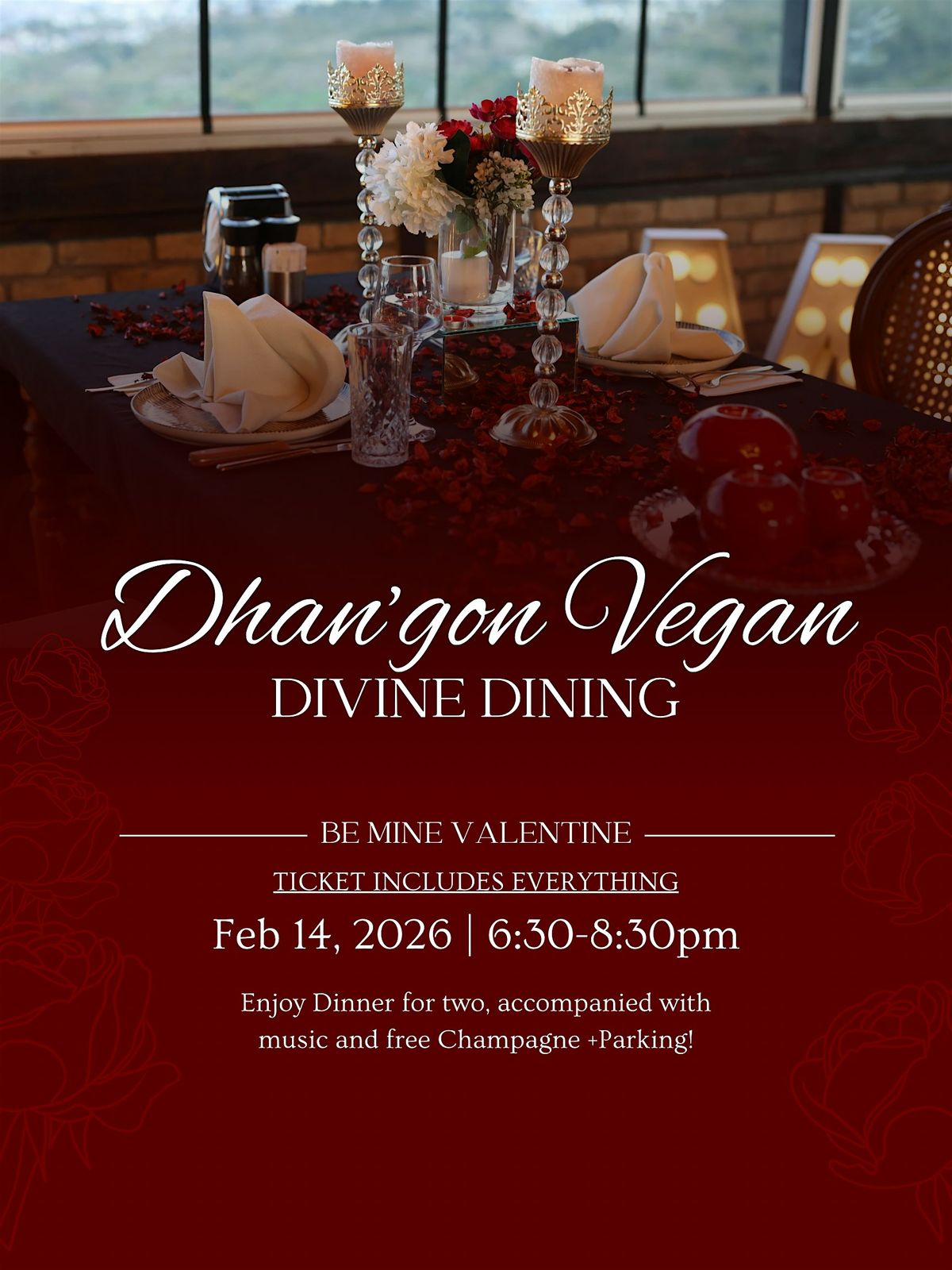 An intimate vegan Valentine’s dining experience with curated cuisine, wine, and romance in an elevated, candlelit setting.