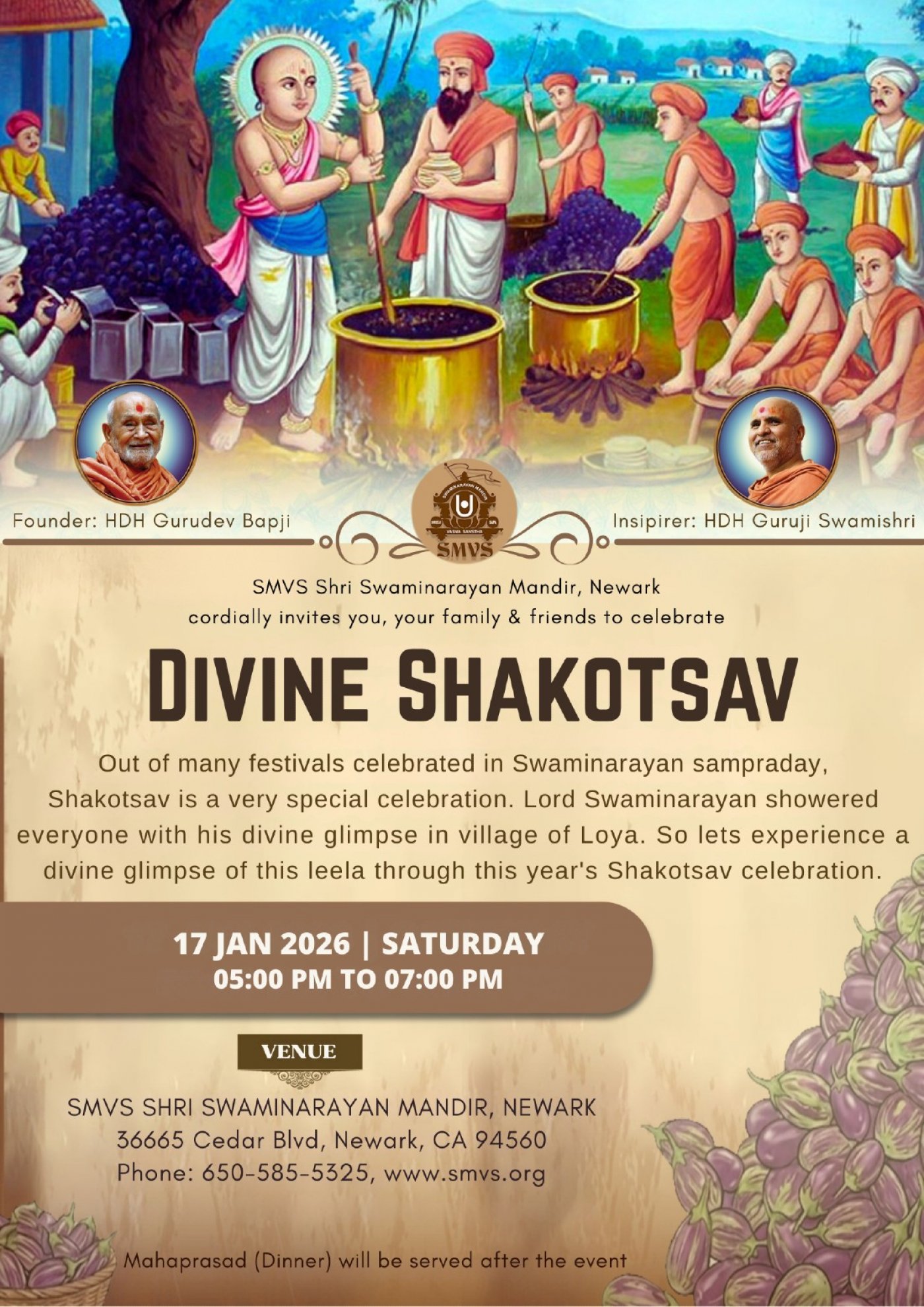 SMVS Shri Swaminarayan Mandir cordially invites you your family and friends to celebrate the auspicious occasion of Divine Shakotsav on January 17 2025 (Saturday) from 5pm to 7pm.