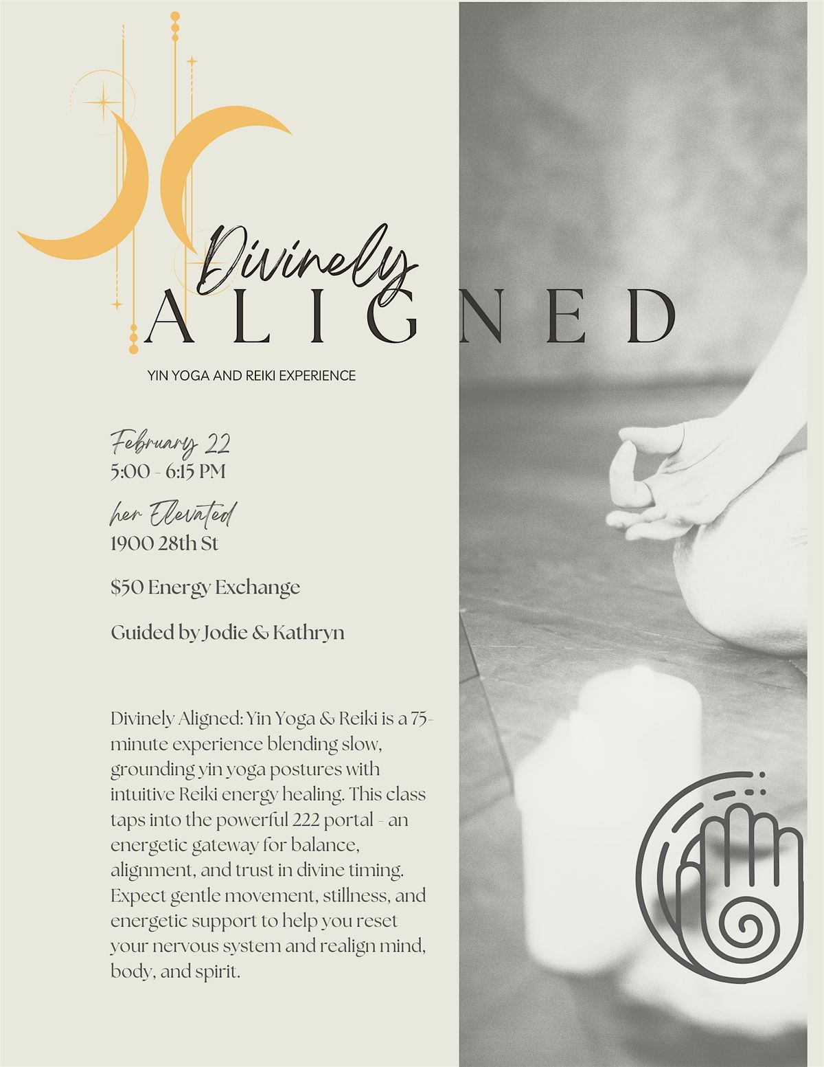 Divinely Aligned: Yin Yoga & Reiki is a 75-minute experience blending slow, grounding yin yoga postures with intuitive Reiki energy healing. This class taps into the powerful 222 portal - an energetic gateway for balance, alignment, and trust in divine timing. Expect gentle movement, stillness, and energetic support to help you reset your nervous system and realign mind, body, and spirit.