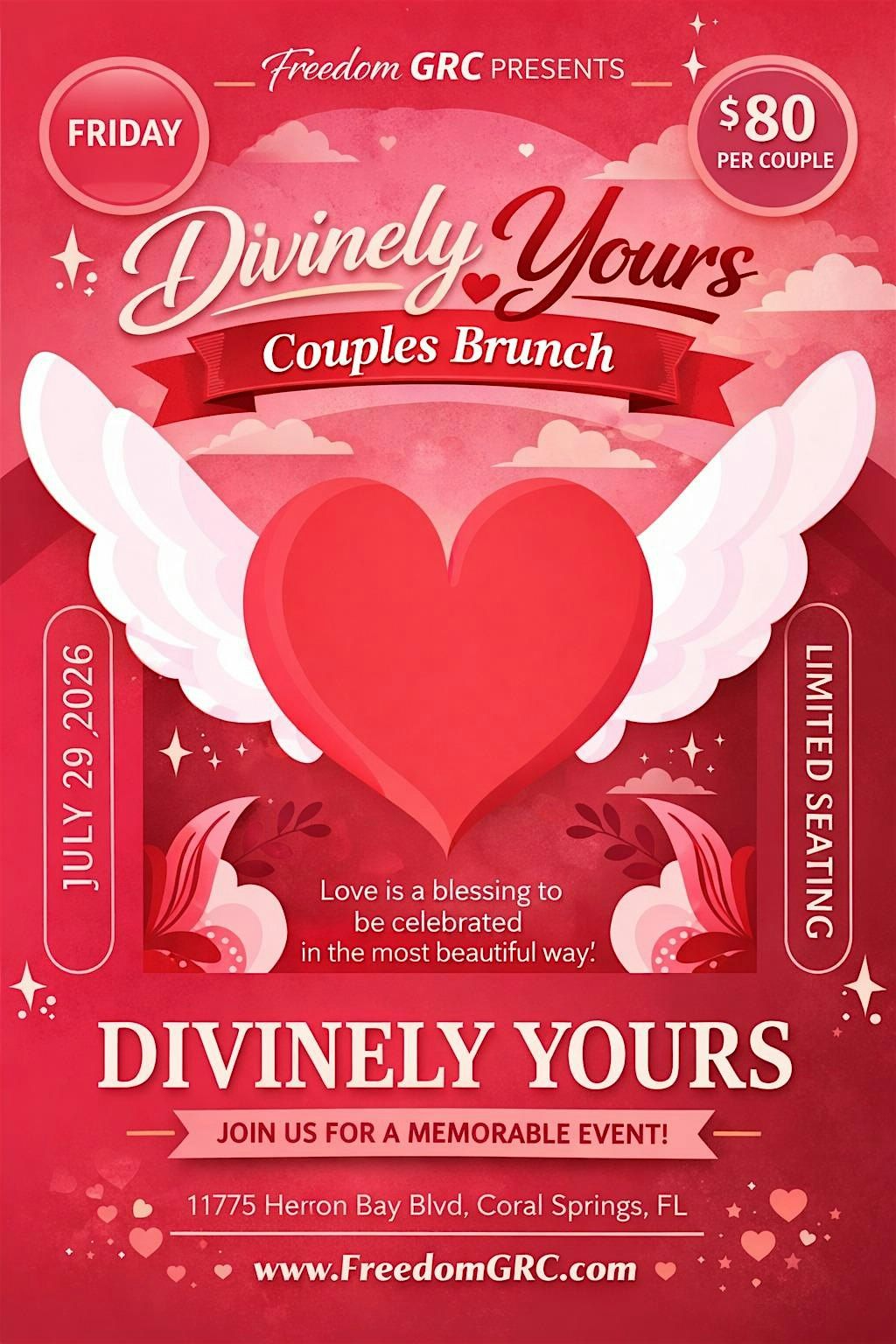 Divinely Yours Couples Brunch is a special Friday experience created for couples to come together, celebrate love, and enjoy meaningful time in a beautiful atmosphere. Hosted by Freedom GRC, this limited-seating event offers a memorable brunch experience designed to inspire connection, reflection, and appreciation for the gift of love. Join us in Coral Springs for a heartfelt gathering that blends elegance, fellowship, and celebration.