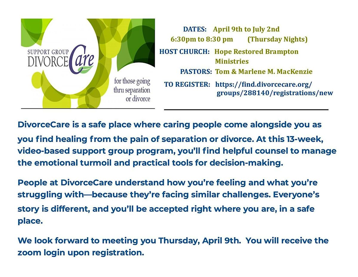 Come as you are, make new friends, and discover helpful tools to navigate this tough time. We’re here to walk alongside you every step of the way! Register here https://find.divorcecare.org/groups/288140/registrations/new