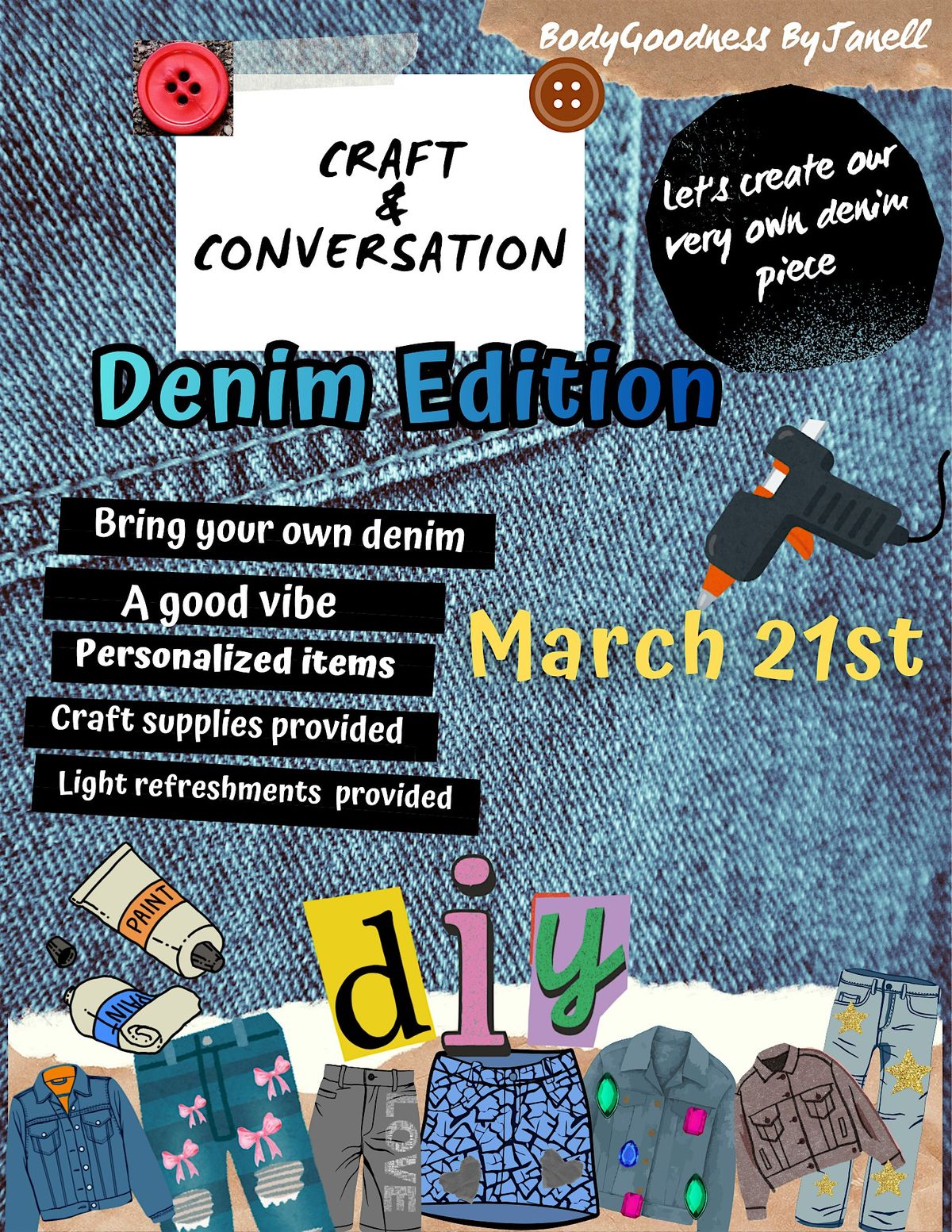 Welcome to the Craft & Conversation DIY Denim Edition Gathering! Come join us at the Local park on March 21, 2026 at 1:00 PM (Pacific Time) for a fun-filled afternoon of creativity and connection. Bring your old denim pieces and get ready to transform them into stylish new creations while chatting with fellow craft sisters. No experience necessary - just bring your enthusiasm and willingness to try something new! And any personal items to make it your own. I can't wait to see the unique designs you come up with and the friendships that will be formed. We'll be on the back side of the park by the tennis courts. See you there!