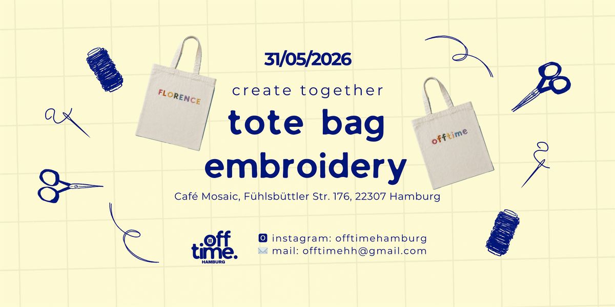 Bei diesem Event besticken wir gemeinsam Tote Bags mit Buchstaben und kleinen Motiven – du kannst aber auch dein eigenes Design umsetzen. Lass deiner Kreativität freien Lauf und gestalte deinen Beutel ganz individuell. Du brauchst keine Vorkenntnisse – es geht ums Ausprobieren, Abschalten und Connecten.