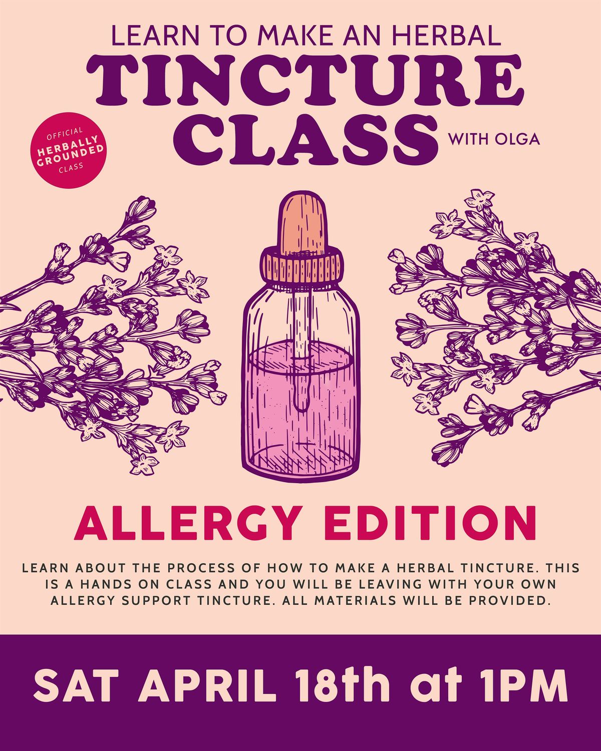 Welcome to our DIY Herbal Tincture Class - Allergy Edition! Join us at Herbally Grounded on Sat, April, 18th at 1:00 PM for a fun and informative workshop. Learn how to create your own herbal tinctures to help with allergies. Our experienced instructors will guide you through the process step by step. Don't miss out on this hands-on learning experience!