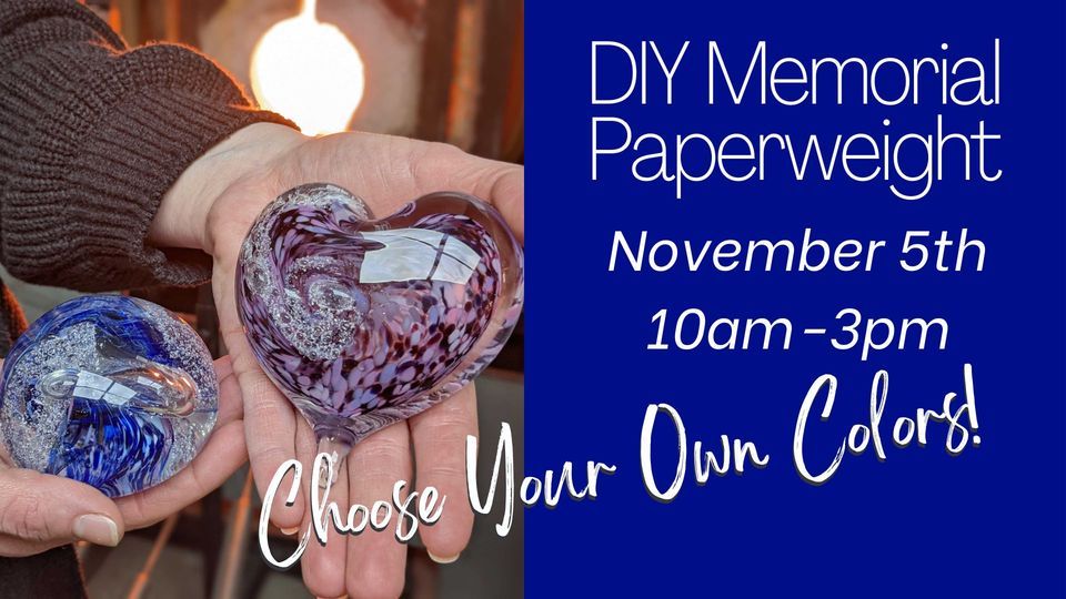 The Day Of The Dead is the perfect time to celebrate and remember loved ones who have passed, so what better way to honor the holiday than by commemorating their spirit in their very own glass piece. Make your own colorful round or heart memorial paperweight from 2000 degree molten glass with the help of our studio artists. You may bring a small portion of cremation ashes from your pet or loved ones to encase in your glass sculpture or simply make a sculpture to commemorate. After a demo of all the steps, tools, and safety guidelines you will pick your colors from a delightfully wide array of choices. When it’s your turn you will hold the steel rod, turn the glass, and use the tools while sitting at the glass blowing bench. So much fun, and like nothing you have ever done before! Watch the glass turn from liquid to solid right before your eyes. Once finished your piece will cool for over 24 hours and be engraved with an inscription of your choice. Ready for you to pick up the following week.
