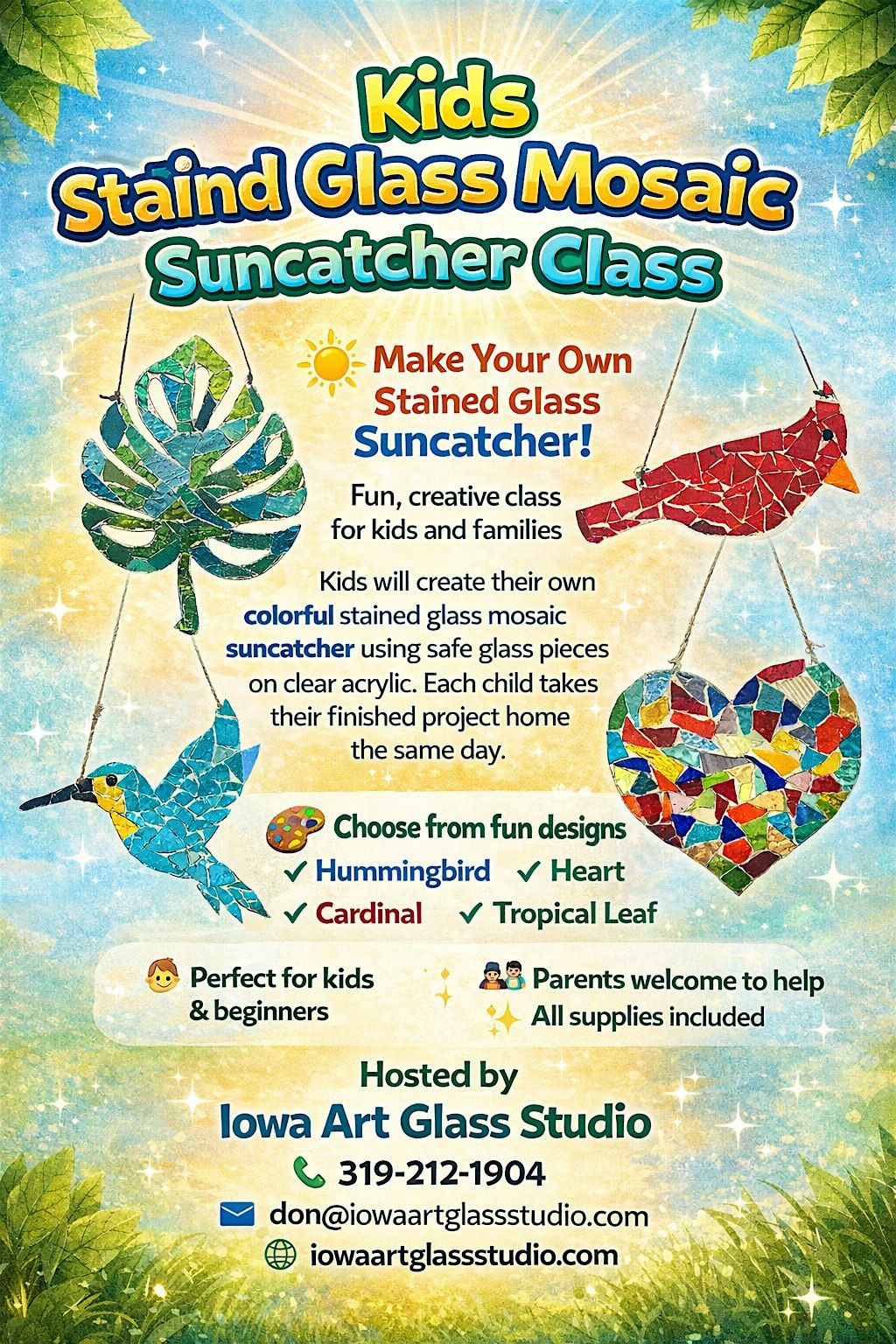 During the class, you'll have the opportunity to choose your own project and learn the basics of stained glass techniques from our skilled instructors. All materials will be provided, so just bring your creativity and get ready to make something beautiful to take home!