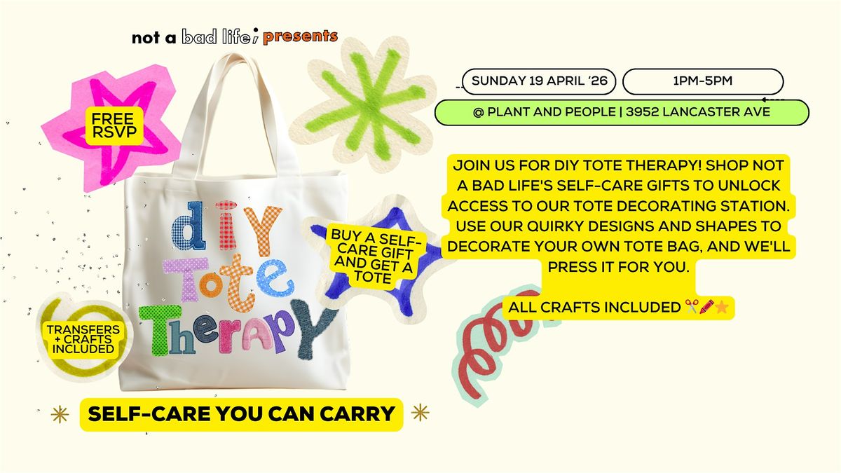 Join us for DIY Tote Therapy! Shop Not A Bad Life's self-care gifts to unlock access to our tote decorating station. Use our quirky designs
